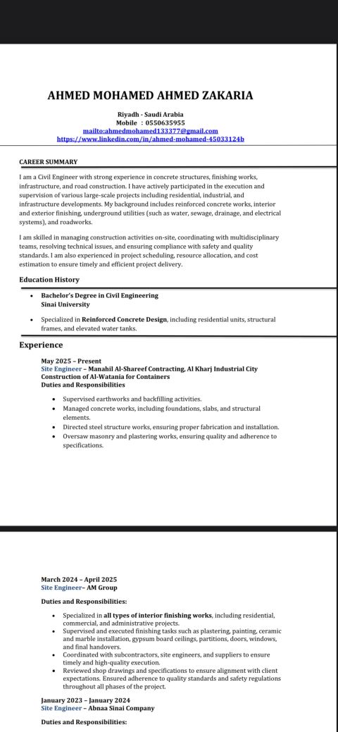 مهندس مدني بخبرة 6 سنوات في أعمال التنفيذ الخرساني والتشطيبات، عملت في مشروعات سكنية، وقادر على إدارة الموقع من البداية حتى التسليم طبقا للمخططات والمواصفات المعتمدة. المهام والقدرات الاشراف الكامل على أعمال التنفيذ بالموقع متابعة المقاولين والعمال وضبط الجودة استلام الأعمال الخرسانية والتشطيبات حصر الكميات واعداد التقارير الالتزام بالبرامج الزمنية اجادة البرامج AutoCAD - Excel - Word - Microsoft