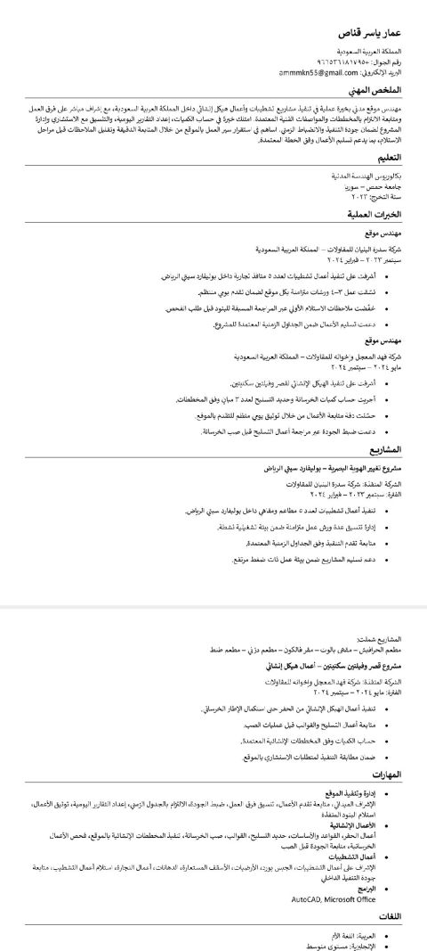 مهندس عمر، مدير انشائي بخبرة مهنية تمتد لأكثر من 11 عاما في إدارة وتنفيذ مشاريع هندسية مدنية وبنية تحتية واسعة النطاق في المملكة العربية السعودية ومصر. أحمل شهادة بكالوريوس في الهندسة المدنية بتقدير امتياز مع مرتبة الشرف الأولى، وشهادة ماجستير تمهيدية، وأتابع حاليا دراسة الماجستير. خلال مسيرتي المهنية، نجحت في قيادة وتنفيذ مشاريع متنوعة، تشمل المستشفيات والمجمعات السكنية والمباني الادارية ومشاريع البنية