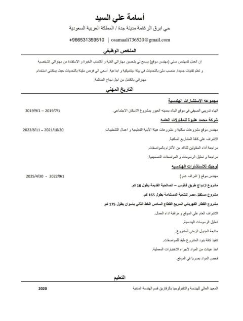 مهندس مدني معتمد (SCE خبرة في إدارة المشاريع تنفيذ واشراف مشاريع الطرق والمباني والبنية التحتية. تنفيذ واشراف بجودة عالية وتسليم ضمن الوقت المحدد. عمل التكلفة والانتاج للمشاريع ورفع المستخلصات جاهز للتنفيذ والاشراف على المشاريع داخل المملكة