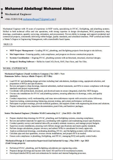 مهندس ميكانيكا سوداني ماجستير إدارة هندسية PMP certified, خبرة أكثر من 9 سنوات في مجال التكييف والسباكة ومكافحة الحرائق، خبرة في المشاريع السكنية والادارية والتجارية والاشراف على الأعمال في الموقع حسب الجدول الزمني للمشروع اجادة أعمال الشوب دروينج وحصر الكميات واعتماد المواد والمخططات، عمل الحسابات التصميمية لأعمال التكييف والسباكة ومكافحة الحرائق، إقامة بمهنة مهندس ميكانيكا قابلة للنقل