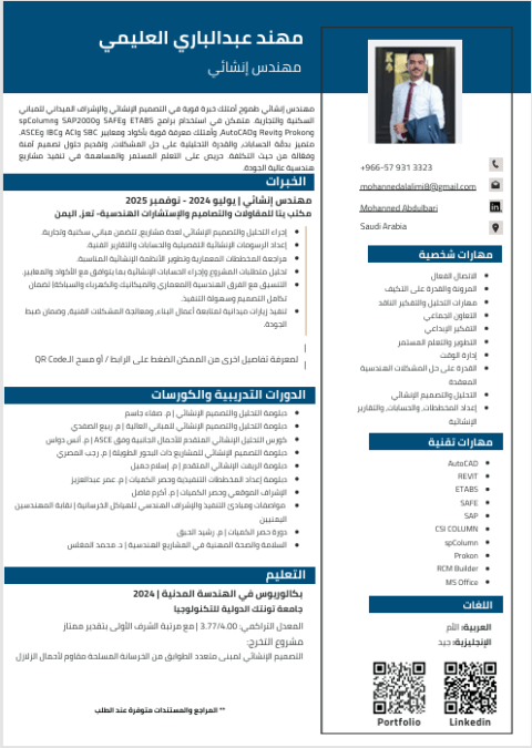 مهندس انشائي خبرة في التصميم الانشائي والاشراف الميداني لمشاريع سكنية وتجارية. خبرة قوية في الأكواد والمعايير الهندسية. بالاضافة الى ذلك متميز في اعداد المخططات الانشائية، والتقارير الفنية. متواجد في المملكة العربية السعودية وجاهز للعمل فورا