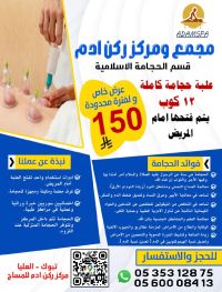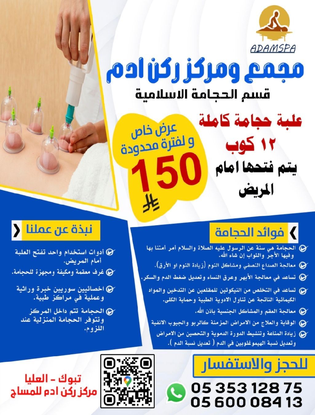 حجامة - ركن آدم للحجامة وقاية من الأمراض كالجلطة والسرطان وأمراض الرئة والتدخين والأبهر ومشاكل النوم وتقوم بتعديل السكر والضغط والكوليسترول والكثير من الأمراض الأخرى - أسعار وعروض منافسة ومناسبة للجميع العرض الحالي 12 كوب 150 ريال لو التزم الشخص بالحجامة كل 4 أشهر لا يحتاج الدخول للمشفى