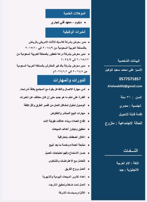 مدير فرع / أخصائي مبيعات عطور بخبرة 10 سنوات يبحث عن فرصة عمل داخل السعودية امتلك خبرة قوية في مجال مبيعات العطور وإدارة الفروع، مع سجل واضح في تحقيق وتجاوز التارجت الشهري رفع متوسط قيمة الفاتورة وزيادة معدل التحويل تدريب وتحفيز فريق المبيعات التعامل باحترافية مع العملاء المترددين واغلاق البيعات تنظيم المعرض وتحسين تجربة العميل لدي خبرة سابقة كمدير فرع، وقادر على اضافة قيمة حقيقية