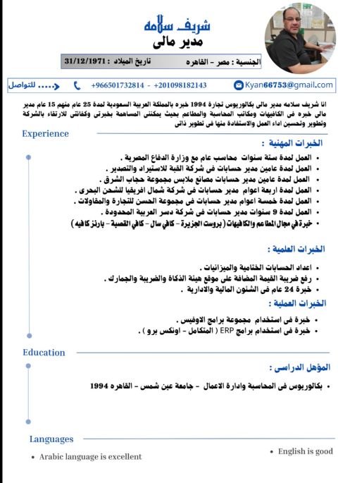 مدير مالي خبرة بالمملكة أكثر من 25 عاما في المملكة ميزانيات وزكاة ودخل قيمة مضافة تأسيس وتنظيم وإدارة فريق مالي تمويل وقوائم وتقرير مالية سبق العمل بشركات مقاولات وكافيهات ومكاتب محاسبة بالمملكة 25 سنة ابحث عن عمل مستقر