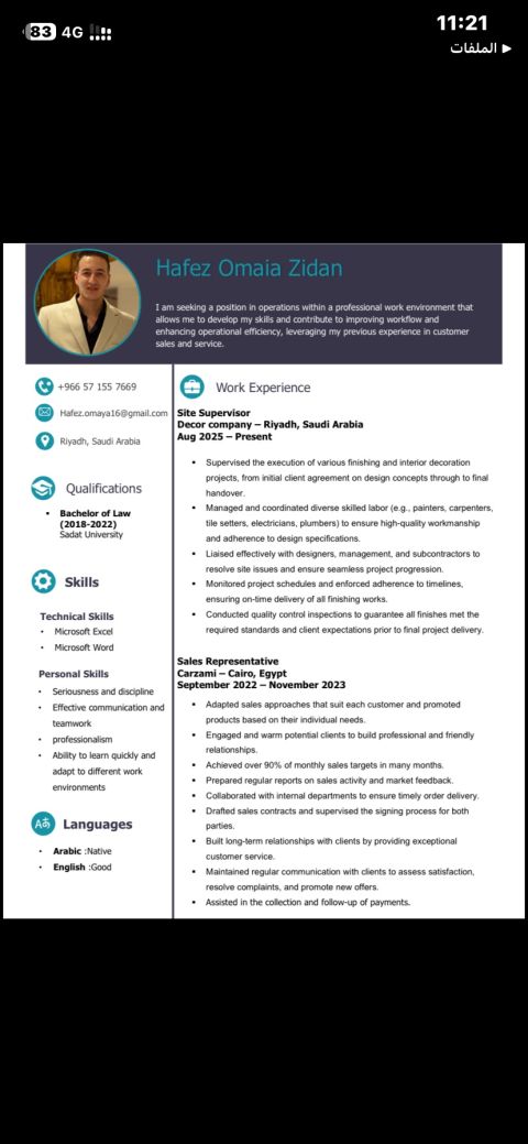 سكرتير قانوني سوداني الجنسية بخبرة أكثر من 9 سنوات في إدارة المكاتب وتنظيم المواعيد. أجيد متابعة القضايا، تنسيق الاجتماعات، إدارة المراسلات، واعداد التقارير بدقة وكفاءة. امتلك خبرة واسعة في استخدام أنظمة وزارة العدل (ناجز ومعين) والخدمات الالكترونية. أجيد استخدام برامج الأوفيس واللغة الانجليزية بدرجة جيدة جدا. ابحث عن فرصة عمل سكرتير قانوني أو اداري أساهم فيها بخبرتي
