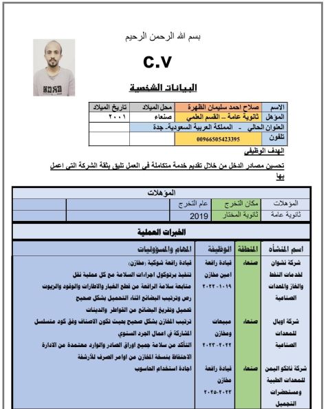 ابحث عن عمل في أي مجال. لدي سيرتي الذاتية توضح خبرتي العملية السابقة أمين مستودع تحميل وتفريغ البضائع في المحلات التجارية أو المراكز التجارية مشغل رافعة شوكية (سكين)
