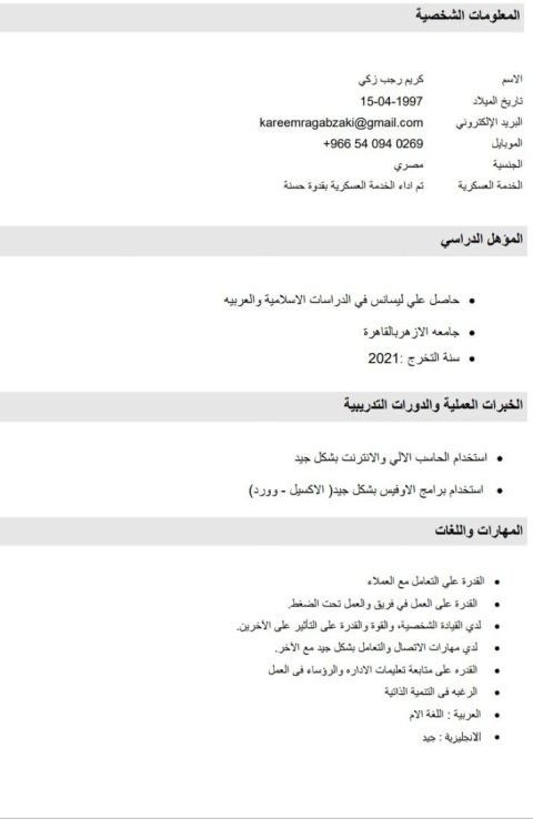كريم رجب مصري الجنسية مقيم بالمملكة العربية السعودية ابحث عن عمل في المملكة العربية السعودية ليسانس في الدراسات الاسلامية والعربية جامعة الأزهر أجيد تدريس اللغة العربية والشريعة الاسلاميه