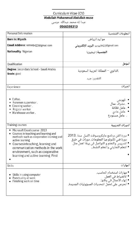 I am a resident of Yemen seeking employment. I have an ID and a health certificate. I have previous experience working in men'clothing stores, grocery stores, restaurants, and public rest areas. I am proficient in driving a car and motorcycle, and I can handle work pressure. I currently reside in Riyadh