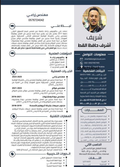 مهندس زراعي مصري خبرة 7 سنوات في استصلاح الأراضي الصحراويه زراعة المحاصيل والفاكهة والنخيل بمزارع القوات ألمسحله المصريه خبرة 3 سنوات في مجال استيراد وتصدير وجودة الحاصلات الزراعية والفاكهة مقيم بي المدينة المنورة