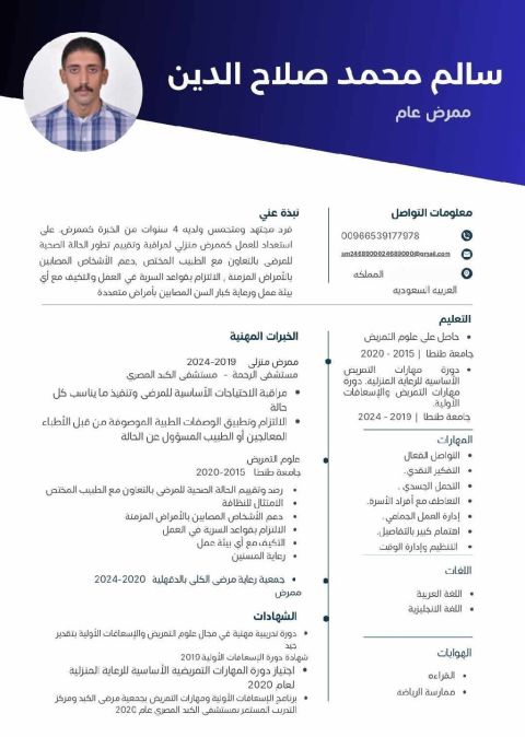 ممرض منزلي ومرافق بالمستشفيات والبيت’ لدي خبرة 4 سنوات في مجال العناية المركزة ومعرفة قياس السكر والضغط وتعامل مع كبار السن والاهتمام بكافة أموره وتعامل مع الأنبوبة الحنجرية وتعامل أم بوبه التغذية