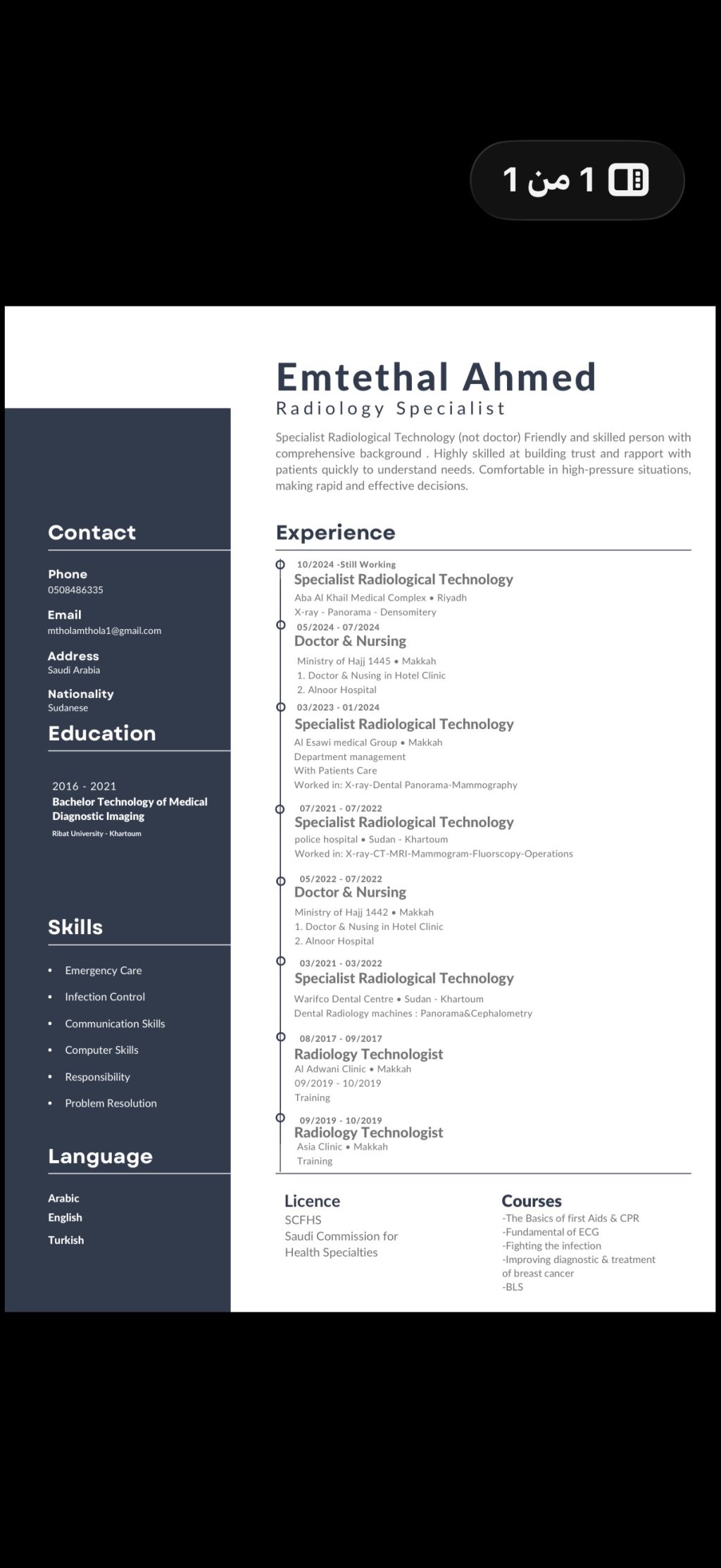 أخصائية أشعة خبرة 4 سنوات في الأشعة السينية والمقطعية والرنين وأشعة الأسنان والملونة والمتحركة وأشعة الماموقرافي التصنيف ساري والإقامة سارية ومجددة الحمدلله / ويكون للمستشفيات