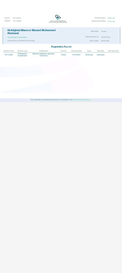 فني مختبرات طبية دبلوم 3 سنوات الجنسية يمني حاصل على ترخيص الهيئة السعودية ابحث عن فرصة عمل في أي مكان متواجد في الرياض
