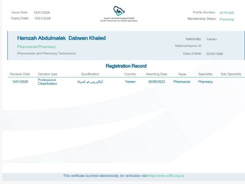 صيدلي يمني مصنف من الهيئة السعودية للتخصصات الصحية أعزب وعمري 27 عام ابحث عن عمل في أي مكان في السعودية ومستعد أن أمضي كل وقتي من اجل العمل والتطور