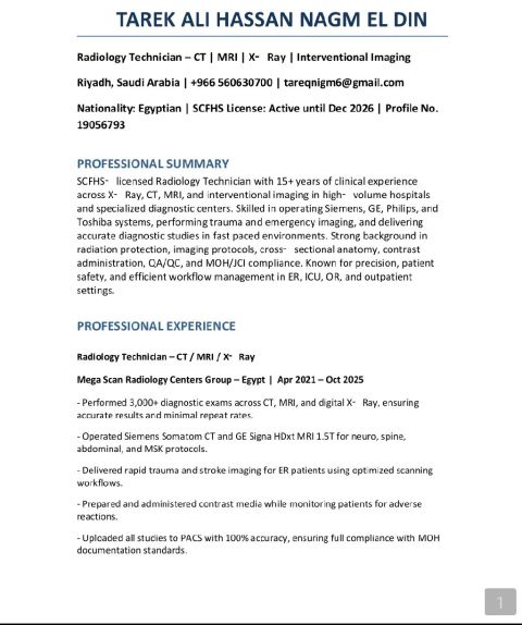 Radiographer Technician Has very long Experience which Extended At15 years until Now At National Liver Institute, My Applity is working With MRI, PET CT, CT Scanners And working on Intervention (Hepatic unit) As will as ERCP UINT, Operation Room C ARM Unit and XRAY machines with deffrant models - Saudi Commission for Health Specialties, Transfer of sponsorship