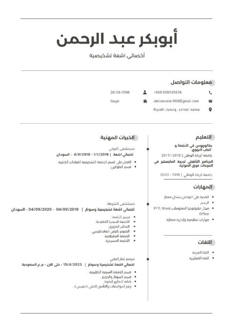 معكم د أبو بكر عبدالرحمن أخصائي أشعة، حاصل على شهادة البكالوريوس في الأشعة التشخيصية، دبلوم تحضيري لماجستير الموجات الصوتية وعندي خبرة 5 سنوات في التصوير الإشعاعي ( X ray Ultrasound) كما أني حاصل على شهادة أل (BICSL) من وزارة الصحة السعودية ابحث عن وظيفة أخصائي أشعة