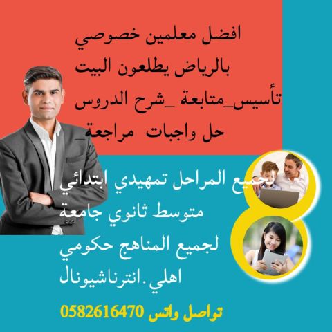 نوفر أفضل معلمات ومعلمين خصوصي بالمملكة يطلعون البيت بأسعار مناسبة تأسيس القراءة والكتابة والأملاء ومتابعة مواد الابتدائي والمتوسط والثانوي للمنهج الحكومي والانترناشونال والأهلي مع حل الواجبات وشرح الدروس ومراجعة الدروس. متخصصين وخبرة طويلة في التدريس وتوصيل المعلومة بطريقة سهلة مجربين من الأهالي وعليهم مدح من الأمهات. تميز وانضباط في الوقت. كلميني واتساب اعطيكي رقم معلمة / معلم في نفس الحي