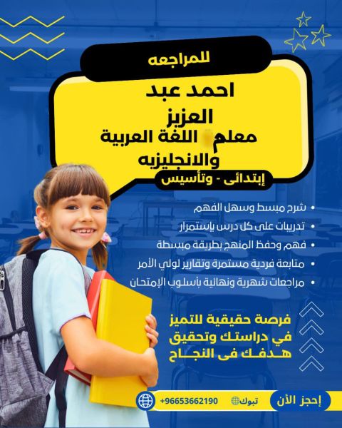 مدرس لغة انجليزية تأسيس & تقوية لجميع المراحل وكمان مادة لغتي عربي بأسلوب مبسط ومضمون شرح مبسط متابعة مستمرة حل واجبات ومراجعات تأسيس من الصفر المكان تبوك للتواصل