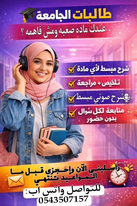 شرح مواد جامعية اونلاين لطالبات الجامعة شرح سهل وبسيط من الصفر تسجيل صوتي واضح تعيدي تسمعيه وقت ما تحبي تلخيص المحاضرات في ملفات PDF مرتبة وسهلة تبسيط المواد العربية والانجليزية فك المصطلحات الانجليزية خطوة بخطوة تفهمي المادة + ملخص جاهز للمراجعة راسليني وحددي المادة. التواصل واتساب فقط للجادين