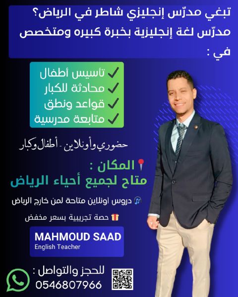 تعبت وأنت تدور على مدرس انجليزي يفهمك ويأسسك صح سواء كنت تبحث عن تأسيس، أو ترغب في تطوير مهارات المحادثة عندك على شان عملك أو سفرك. أنا هنا على شان أساعدك معكم الأستاذ محمود سعد، خبرة طويلة في تدريس اللغة الانجليزية وتبسيطها لكل المستويات في مدينة الرياض. ليه تختار الدراسة معي تأسيس من الصفر بأساليب تعليمية ممتعة تناسب الاطفال وتخليهم يحبون اللغة. محادثة للكبار بنكسر حاجز الخوف ونركز عل