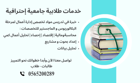 متاح محاضرات حضوري وأون لاين لطلبه وطالبات التخصصات الاداريه أداره أعمال، محاسبه، ماليه، اقتصاد، احصاء، لطلبه الجامعات والمعاهد Business and administrative Mathematics Statistics Calculus Quantitative methods for business Financial Accounting Management Finance Management Accounting Project Management Long Term Finance Working Capital Economics للاستفسار علي رقم