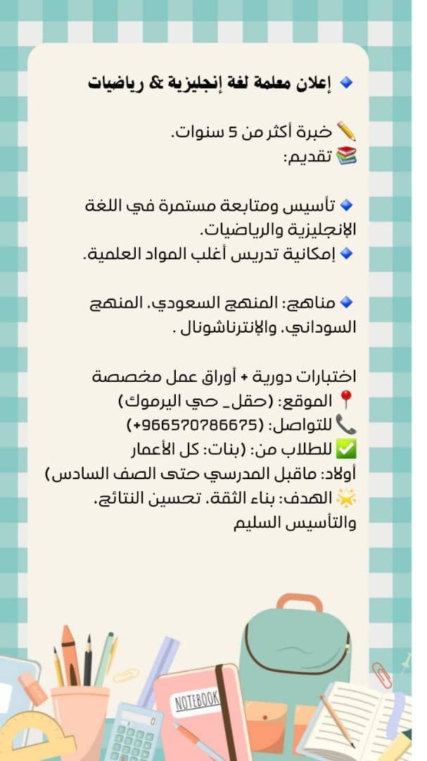 معلمة لغة انجليزية ورياضيات تأسيس ومعالجة ومتابعة مستمرة المكان تبوك حقل