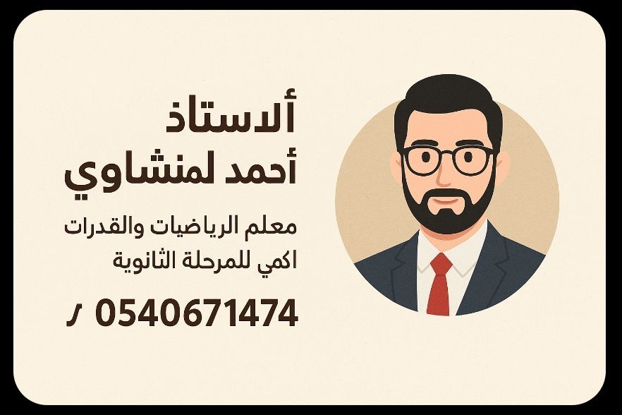 معلم دروس خصوصيه. معلم رياضيات ومتابعة للمرحلة المتوسطه والثانوية. معلم تأسيس وتدريب القدرات الكمي. العنوان محافظة طريف. الاسم أحمد جمعه منشاوي