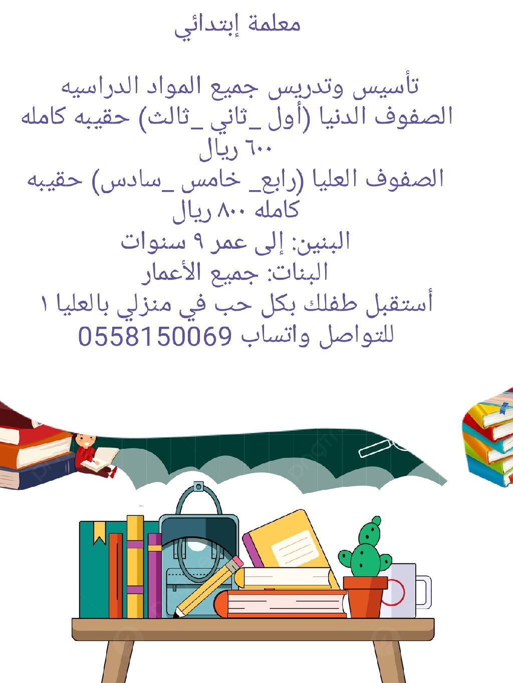 معلمة ابتدائي تأسيس وتدريس جميع المواد الدراسية الصفوف الدنيا (أول - ثاني - ثالث) حقيبة كاملة 600 ريال الصفوف العليا (رابع - خامس - سادس) حقيبة كاملة 800 ريال البنين الى عمر 9 سنوات البنات جميع الأعمار أستقبل طفلك بكل حب في منزلي بالعليا 1 للتواصل