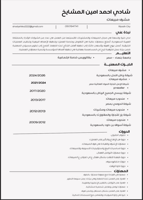 مدير مبيعات محترف يتمتع بخبرة عملية تزيد عن عشر سنوات مع سجل مثبت في تحقيق الأهداف البيعية، بناء علاقات طويلة الأمد مع العملاء، وتوسيع الحصة السوقية. أبرز نقاط القوة خبرة عميقة في التعامل مع مختلف شرائح العملاء. قدرة عالية على التفاوض، الاقناع، واغلاق الصفقات بكفاءة. فهم ممتاز لطبيعة السوق السعودي وفهم ثقافة العملاء. اعداد وتنفيذ خطط مبيعات ناجحة تساهم في زيادة الايرادات. متابعة العملاء وبناء علاقات