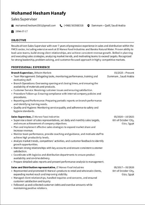مشرف مبيعات بخبرة تتجاوز 8 سنوات في إدارة وتطوير المبيعات، عمل لدى شركات كبرى مثل المروة للصناعات الغذائية وبركة للمياه الطبيعية. يتمتع بقدرة مثبتة على قيادة فرق المبيعات، تحقيق وتجاوز المستهدفات، وتنمية قاعدة العملاء. متمرس في بناء استراتيجيات بيع فعالة وتحليل الأداء. مقيم بالمملكة العربية السعودية وأسعى لفرصة أساهم من خلالها في زيادة المبيعات وتعزيز نمو الأعمال