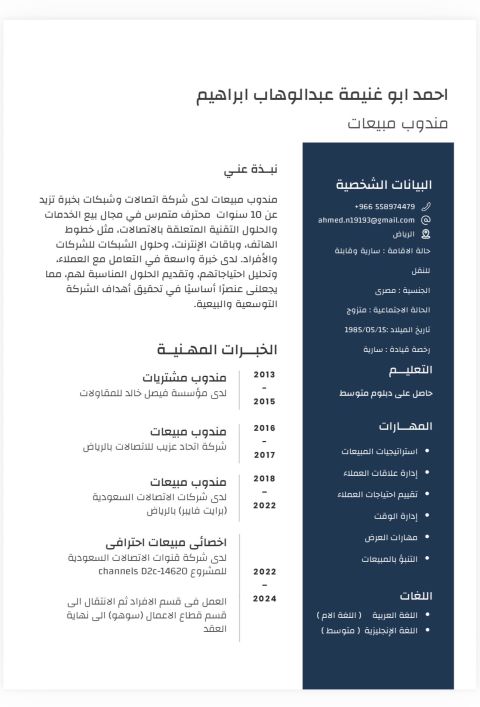 مندوب مبيعات مصري متحمس حامل على رخصة قيادة سعودية، لدي خبرة في تحقيق أهداف المبيعات وإدارة علاقات العملاء، ماهر في تقديم حلول مخصصة لتلبية احتياجات العملاء وتعزيز من ولأيهم للشركة، أطمح للانضمام الى شركة مرموقة أساهم فيها بخبراتي في تحقيق أهداف المبيعات وتنمية قاعدة العملاء وتحقيق أهداف المنظمة