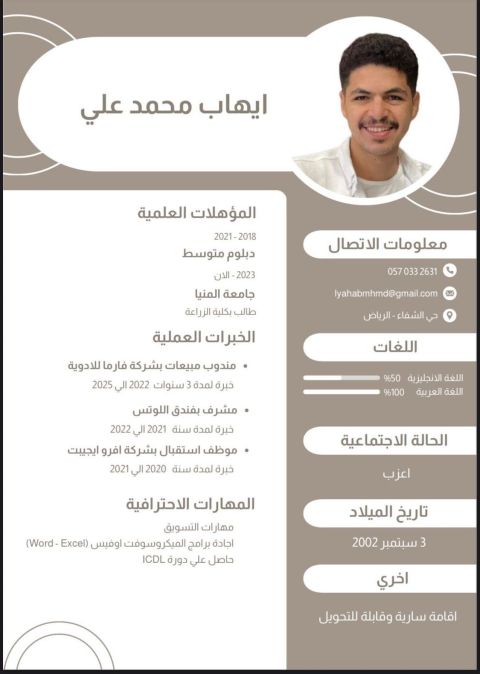 ابحث عن وظيفة مندوب مبيعات. لدي خبرة عملية في مجال المبيعات، حيث عملت سابقا في شركة الناغي - قسم نستله في الرياض مؤسسة تجاه للحلويات في القصيم معمل بيري للحلويات امتلك خبرة جيدة في التعامل مع العملاء وتوزيع المنتجات ومتابعة نقاط البيع. العمر 27 سنة رخصة القيادة سارية الإقامة منتهية