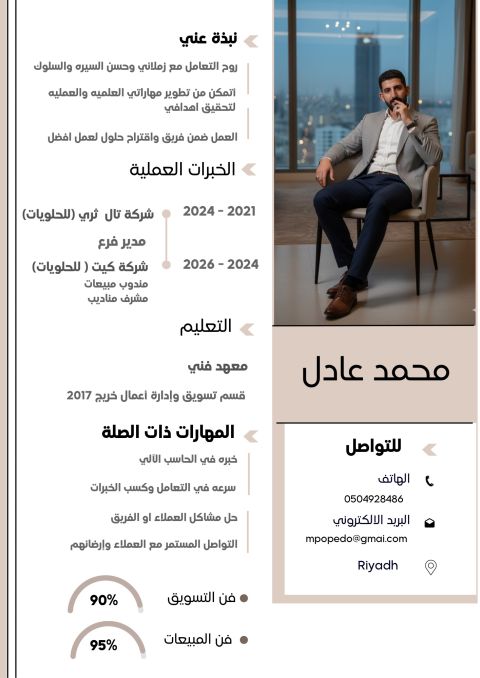 مندوب مبيعات محترف بخبرة في قطاع الملابس والمواد الغذائية، متخصص في تنمية المبيعات الميدانية، وإدارة حسابات العملاء، وفتح أسواق جديدة. لدي سجل في تحقيق التارجت وزيادة حجم الطلبات من خلال مهارات العرض والتفاوض والمتابعة الدورية لنقاط البيع. أجيد قراءة احتياج العميل واقتراح المنتجات المناسبة، مع التزام كامل بالانضباط وجودة الخدمة