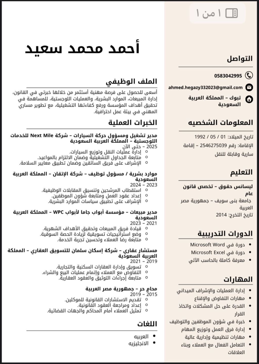 أنا مصري - حاصل على ليسانس حقوق لدى رخصة قيادة إقامة سارية قابلة للنقل - مقيم في مدينة تبوك - سبق لي العمل كمحامي في مصر لمدة 5 سنوات وداخل المملكة سبق لي العمل كمسوق عقاري - مندوب مبيعات - مشرف تشغيل. ابحث عن عمل