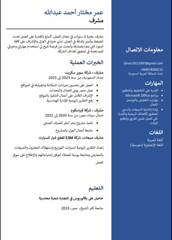 خريج كلية التجارة شعبة المحاسبة سنة 2023 27 عام، لدي خبرة في المبيعات كمندوب ومشرف مبيعات والاشراف بشكل عام وخبرة في الاشراف على المقاولات وأسعى لتحقيق الأهداف الربحية للشركة ولدي القدرة للعمل تحت ضغط العمل والعمل ضمن فريق وأسلوب خاص للاقناع ولحل المشكلات التي تواجه العملاء والتفاوض في البيع وتحليل السوق واطمح لاستخدام خبراتي في تحقيق أهداف الشركة
