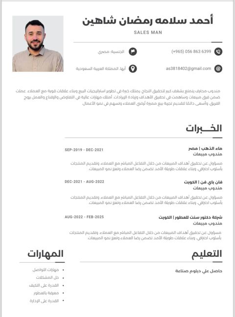 مندوب مبيعات ذو خبرة قوية في مجال البيع والشراء وإدارة العملاء، امتلك مهارات عالية في تحقيق أهداف المبيعات وزيادة الايرادات بناء علاقات طويلة الأمد مع العملاء التفاوض والاقناع واغلاق الصفقات إدارة المناطق البيعية ومتابعة التحصيل العمل الميداني وتحمل ضغط العمل عملت كمندوب مبيعات لسنوات، اضافة الى خبرة عملية في إدارة متجر (بقالة) لمدة 5 سنوات، مما عزز لدي فهم السوق واحتياجات العملاء