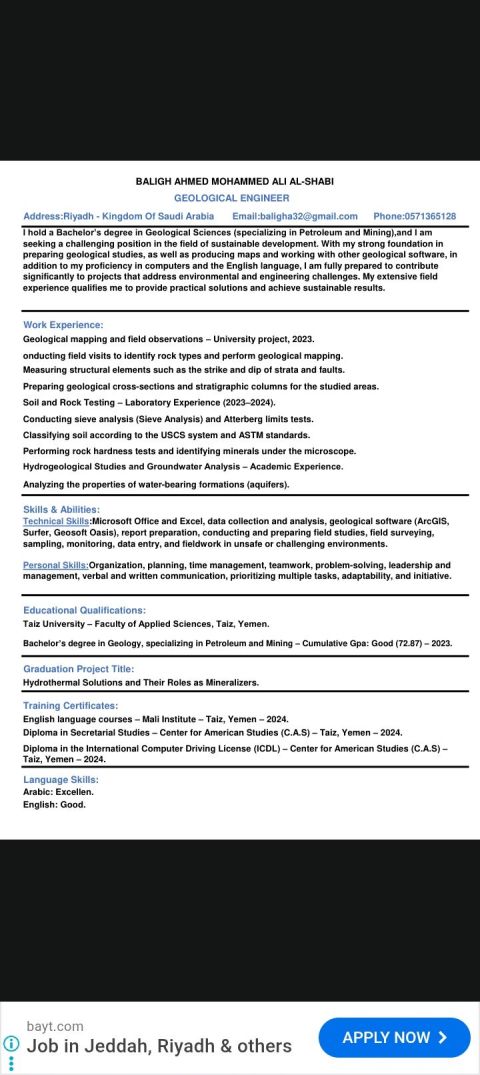 مهندس جيولوجي متواجد في الرياض ابحث عن فرصة عمل في أي منطقة ب المملكة متاح للعمل فورا