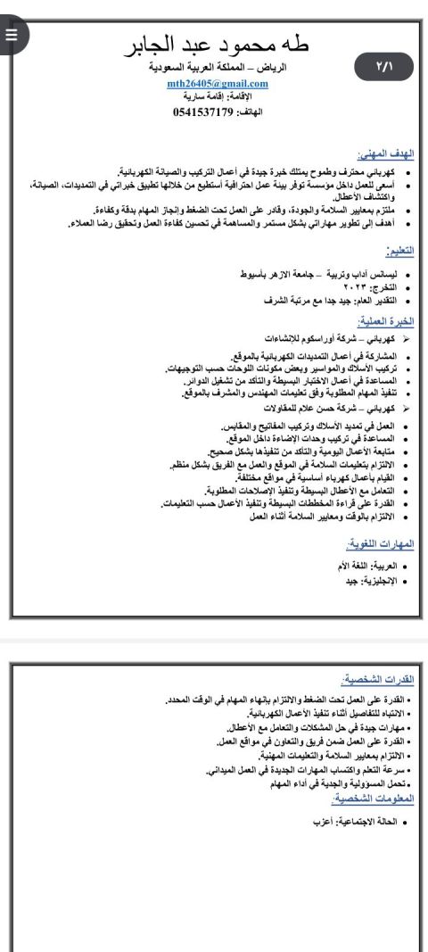 أنا كهربائي جيد وأريد العمل لدي بعض الشركات لتطوير مهاراتي وافادة المؤسسة بما أستطيع وبما لدي من خبرات ومهارات في مجال الكهرباء ولدي اقامة سارية