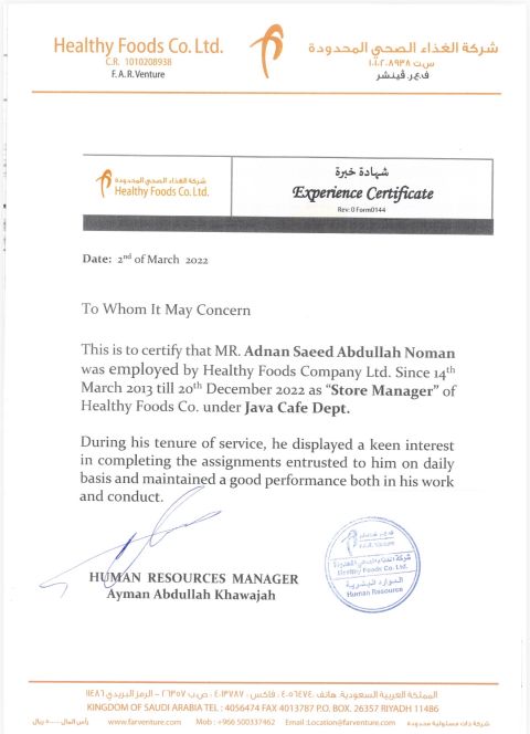 مدير مطاعم وكافيهات أفضل الشركات (افتتاح خلية خالد وشاي وسمسم مؤخرا) خبرة 12 عام ادارة مطاعم 6 سنوات international والفنادق 5 نجوم كافيهات شهادة كمبيوتر ICDL iso معتمدة دوليا انجليزي ممتاز مدرب عمال منسق حفلات ومؤتمرات تم فتح أكثر من 7 مطاعم وتجهيزهم بكالوريوس دراسات عليا مقيم في عرعر إقامة سارية فترة الانتقال 90 يوم اشعار من العمل القديم