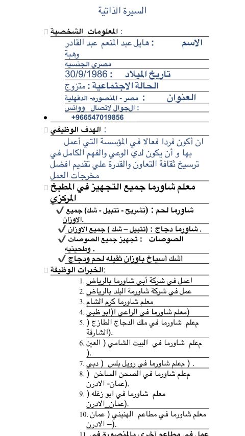 شيف مصري مقيم في السعودية، خبرة قوية في بيتزا شاورما (تتبيل وتشغيل) برجر وساندوتشات تأسيس وتشغيل المطاعم من الصفر شهادة صحية سارية جاهز للعمل فورا - نقل كفالة متاح