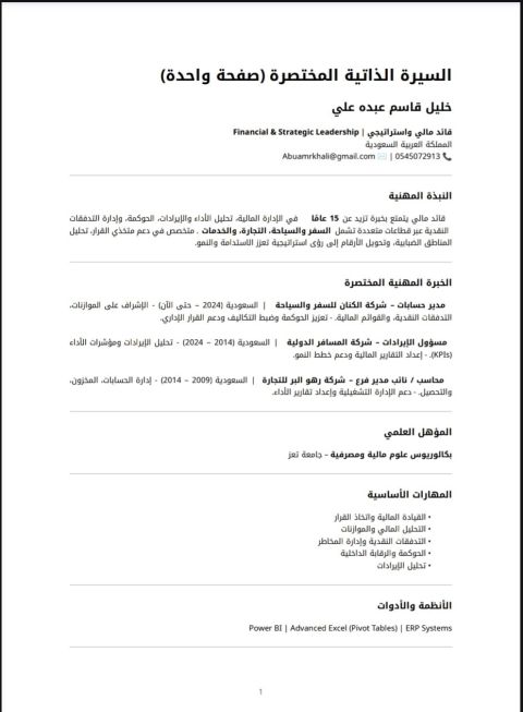 قائد مالي واستراتيجي يتمتع بخبرة تتجاوز 15 عاما في الإدارة المالية، تحليل الايرادات، الحوكمة، والاشراف التشغيلي عبر قطاعات متعددة تشمل السفر والسياحة، التجارة، التسويق، والخدمات. يتميز بقدرة عالية على التعامل مع المناطق الضب أبية، دعم متخذي القرار، وتحويل البيانات المالية الى رؤى استراتيجية تسهم في تحقيق الاستدامة المالية وتعزيز الأداء المؤسسي في بيئات عمل معقدة ومتغيرة