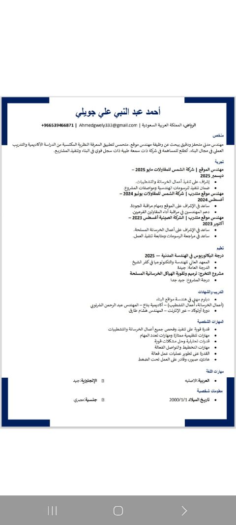 مهندس مدني تنفيذ (مصري) خبرة سنة خبرة عملية في أعمال الخرسانات والتشطيبات