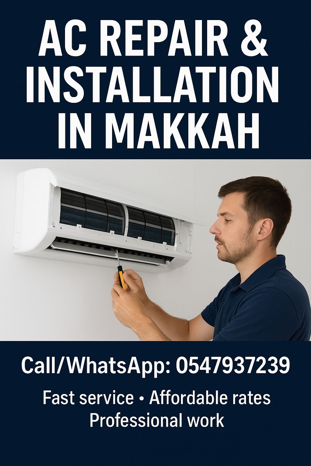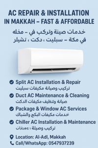 Professional AC Services in Mecca We provide expert air conditioning solutions for homes, offices, and commercial projects Split AC Installation & Repair Duct AC Maintenance & Cleaning Package & Window AC Services Chiller AC Installation & Maintenance Location Al - Adl, Mecca Call/ WhatsApp Fast service - Affordable rates - Professional work