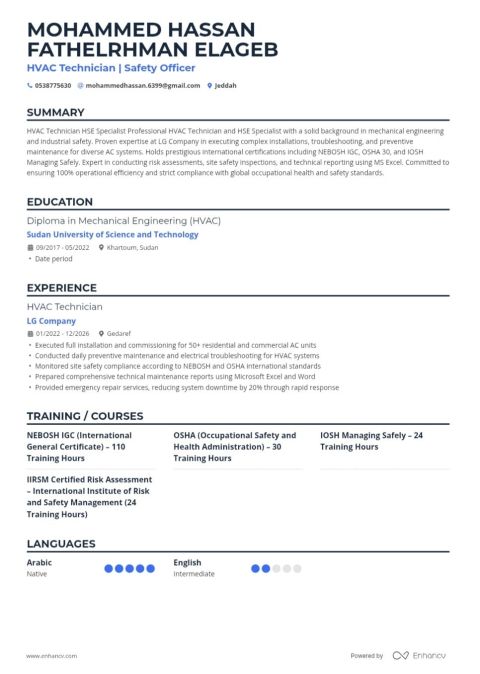 ابحث عن عمل في مجال السلامة حاصل على شهادة NEBOSH IGC وOSHA STANDARDS وIOSH MANAGING SAFELY أو مشرف عمال حاصل على دبلوم ميكانيكا تبريد وتكييف إقامة سارية