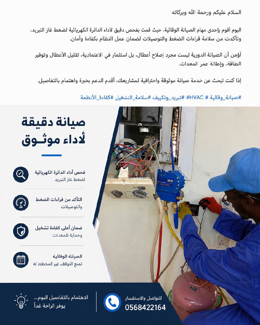 فني تكييف وتبريد وصيانة عامة بخبرة عملية في تركيب وصيانة جميع المكيفات، وغسيل وتنظيف الوحدات، وكشف الأعطال وإصلاحها. لدي القدرة على تركيب وفك جميع أنواع المكيفات صيانة دورية واصلاح الأعطال بسرعة غسيل وتنظيف المكيفات باحترافية التعامل الجيد مع العملاء والعمل تحت الضغط ابحث عن فرصة عمل في شركة أو مؤسسة، أو العمل بنظام عقد / دوام كامل