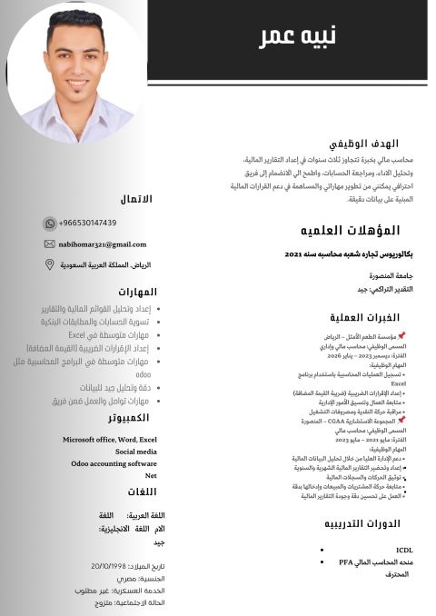 خريج بكالوريوس كلية تجارة بمرتبة الشرف من جامعة النيل، لدي تدريب عملي في المحاسبة باستخدام أنظمة ERP، وخبرة تدريبية في شركة شيكان للتأمين. امتلك أساس قوي في القيود المحاسبية والتقارير التعامل مع برامج المحاسبة وExcel الجدية والرغبة في التطور المهني متواجد في السعودية - الرياض جاهز للعمل فورا يسعدني استقبال الفرص عبر الخاص