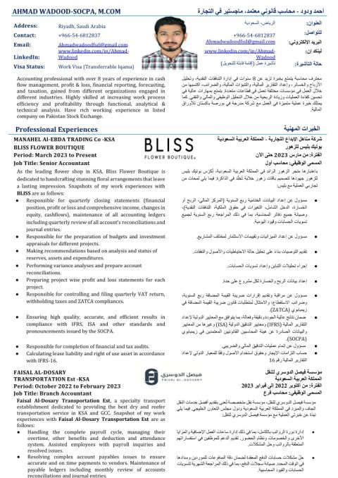 أنا محاسب مالي أتمتع بقدر كافي من المهارات Excel. ERP كفء في عملي وأداء المهام التي توكل الى والعمل بروح الجماعة والفردية ومفارس للبرامج المحاسبية والأوفيس والسرعة في التطوير وتجويد العمل، الجوال الجنسية. سوداني القيام بالعهام التالية متابعه وضبط حسابات العملاء والخزينة، اعداد التنسويات للحسابات البنوك اعداد الاقرارا الضربية. اعداد القوائم المالية، أحمل أقامه عمل