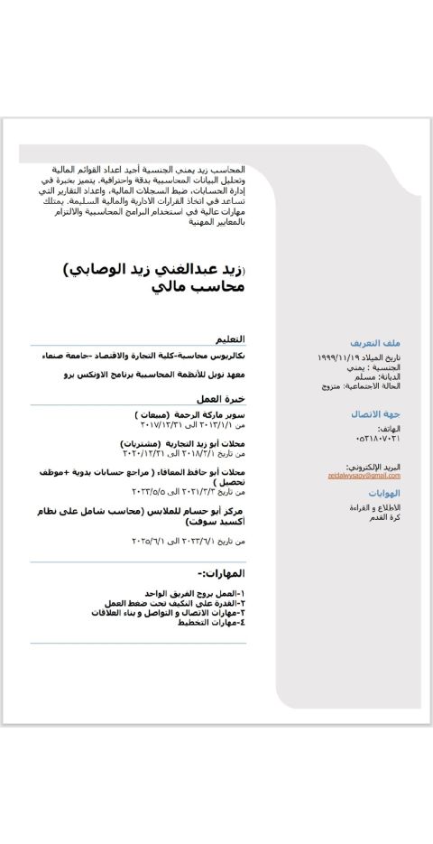 المحاسب زيد الوصابي يمني الجنسية محاسب محترف وأجيد اعداد القوائم المالية وتحليل البيانات المحاسبية بدقة واحترافية. يتميز بخبرة في إدارة الحسابات، ضبط السجلات المالية، واعداد التقارير التي تساعد في اتخاذ القرارات الادارية والمالية السليمة. يمتلك مهارات عالية في استخدام البرامج المحاسبية والالتزام بالمعايير المهنية