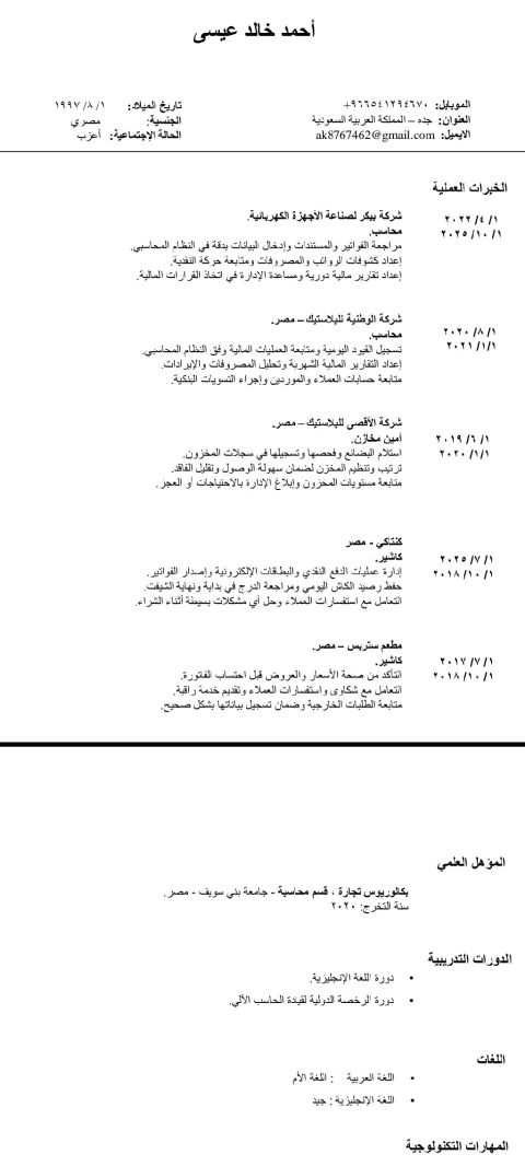محاسب فني زراعي خبرة في الأعمال المحاسبية اعداد ومتابعة الحسابات وخبرة في المجال الزراعي تطعيم وتقليم الأشجار ومتابعة والاشراف على جميع الأعمال الزراعية