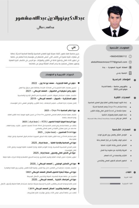 ابحث عن فرصة عمل في المملكة العربية السعودية في مجال المحاسبة أو وظيفة ادارية. أنا يمني الجنسية ومقيم حاليا في جدة. المؤهلات بكالوريوس محاسبة دبلوم لغة انجليزية رخصة قيادة الحاسب الآلي (ICDL) دورات متعددة في المجال المحاسبي مثل (المحاسبة والإدارة الماليه - التحليل المالي والجدوى - الاكسل المحاسبي) المهارات اجادة برنامج Onyx Pro المحاسبي فهم ممتاز لأساسيات المحاسبة ومعايير القيد المحاسبي مستعد للعمل
