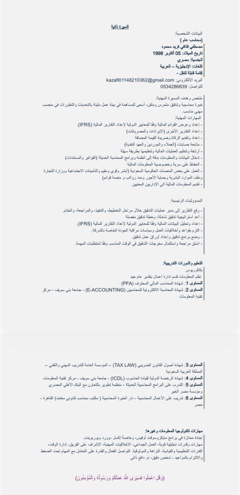 محاسب مصري - 27 سنة - خريج كلية التجارة، قسم محاسبة. بتقدير جيد جدا. الخبرة العملية - سنتين في شركات مصرية (ديار المصرية - و6 شهور في السعودية) المهارات تسجيل القيود اليومية، المشتريات والمبيعات. التعامل مع ضريبة القيمة المضافة ومتابعة العمليات الضريبية. اعداد التقارير الشهرية. تسوية الحسابات البنكية. رفع الاقرار الضريبي اتقان برامج مايكروسوفت أوفيس - اتقان برنامج أسماك وبرنامج الفارس وقيود